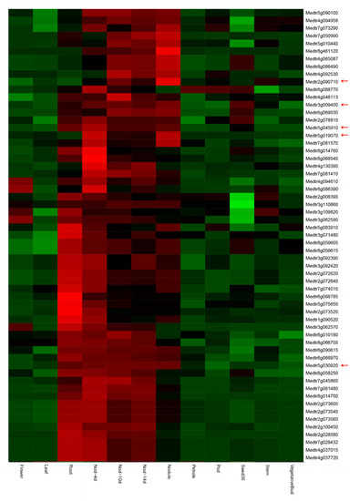 Organ expression patterns of the MtLRR-RLKs which are highly expressed in root and nodule (https://mtgea.noble.org/v3/). Red arrows indicate genes that highly expressed in root, nodule and skl mutant under rhizobium infection.
