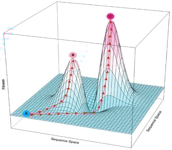 Rugged fitness landscape with multiple fitness peaks. The x and y axes represent the multidimensional sequence space defined by different possible sites and identities of mutations in an enzyme; the z-axis is fitness as a function of sequence. Red arrows show possible evolutionary paths created by mutation and selection. An enzyme at suboptimal fitness level A could potentially reach local fitness peak B or global optimal peak C. Because the path from A to C passes through a fitness valley, it is more difficult to follow under selection than the continuously upward path from A to B.
