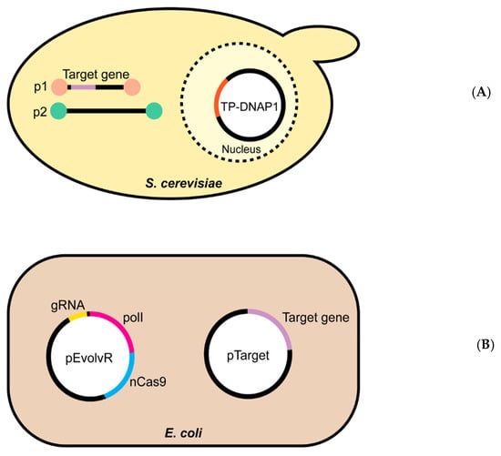 The yeast OrthoRep system was developed from the p1 and p2 linear cytoplasmic plasmids of Kluyveromyces lactis [27,31,32,33]. The p1-specific DNA polymerase TP-DNAP1 was transferred from p1 to a nuclear plasmid, leaving a backbone into which a target gene can be introduced (Figure 2A); p2 remains in its native state, encoding its own DNA polymerase (TP-DNAP2) and the machinery needed to transcribe both p1 and p2 [33]. For continuous directed evolution, error-prone versions of TP-DNAP1 have been engineered; these polymerases introduce mutations into the p1-borne target gene without increasing the genomic mutation rate (Figure 2A). Error-prone TP-DNAP1s have mutation rates as high as 1 × 10−5 substitutions per base, which is up to 105 times that of the host genome [27,33]. The ~105-fold mutational acceleration, combined with serial passaging, enables rapid, continuous evolution of the target gene entirely in vivo. OrthoRep is compatible with high-throughput, automated systems, including some that can impose diverse and adjustable selection pressures to help cross fitness valleys [30].