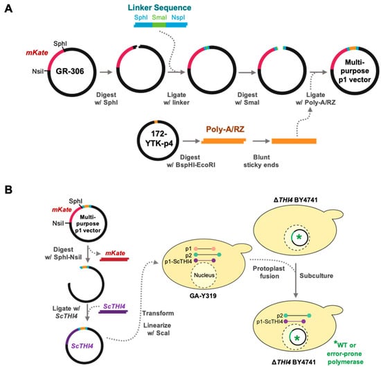 Construction of the multipurpose p1 integration vector for OrthoRep. (A) A linker sequence containing a SmaI site was introduced into the SphI site of the GR306 plasmid in such a way as to retain the SphI site. This linker allowed insertion of the poly-A/RZ module from 172-YTK-P4 into GR306. The resulting construct is a multipurpose integration vector from which the resident mKate gene can be excised with NsiI and SphI and replaced with a target gene. (B) The yeast THI4 (ScTHI4) gene was introduced into the multipurpose integration vector as above; the construct was linearized by ScaI and transformed into yeast strain GA-Y319, and homologous recombination integrated ScTHI4 into the p1 plasmid. Finally, protoplast fusions were carried out between GA-Y319 (donor strain) and ΔTHI4 BY4741 strains carrying the DNA polymerases TP-DNAP1_wt, TP-DNAP1_611, or TP-DNAP1_633 (receptor strains). Selective medium without leucine, histidine, and tryptophan favored the growth of ΔTHI4 BY4741 cells carrying the full OrthoRep system plus ScTHI4.