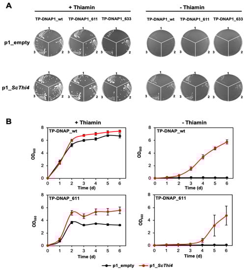 Independent clones of ΔTHI4 BY4741 carrying nuclear plasmids harboring TP-DNAP1_wt, TP-DNAP1_611, or TP-DNAP1_633 and plasmids p1_ScTHI4 or p1_empty plus wild type p2 were used to inoculate 3 mL of SC minus leucine, histidine, and tryptophan supplemented with 1 g/L monosodium glutamate, 100 nM thiamin, and 200 μg/mL G418 (complementation medium). After 48 h of incubation at 30 °C and 200 rpm, cells were pelleted (3000 g, 5 min) and washed in 5 mL of complementation medium minus thiamin. Aliquots diluted to OD660nm = 0.05 were inoculated in complementation medium plus or minus thiamin and growth was monitored at OD660nm.