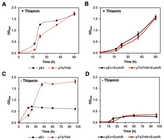 Attempted complementation of an E. coli ΔthiG strain by TaTHI4 using components of the EvolvR system. E. coli ΔthiG cells harboring the pCDFDuet-placO vector alone (pEv) or containing the TaTHI4 (pTaTHI4) gene were cultured in MOPS minimal medium containing 0.2% (w/v) glycerol, 1 mM IPTG, and 1 mM cysteine with 100 nM thiamin (A) or without thiamin (C). ΔthiG cells harboring both pEvolvR and pEv or pTaTHI4 were cultured in MOPS minimal medium plus glycerol, cysteine, and IPTG as above, with 100 nM thiamin (B) or without thiamin (D). Values are means ± standard error (SE) of three independent replicates. Where no error bars appear, they are smaller than the symbol.