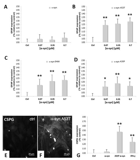 Morphological changes typical of reactive astrocytes within the injured or diseased brain are generally associated with the expression of growth inhibitory molecules, of which chondroitin-sulphate proteoglycans (CSPGs) are the major family expressed by reactive astrocytes []. We, therefore, investigated whether mutant α-syn alters expression of CSPGs by astrocytes. Exogenous A53T α-syn treatment induced significant upregulation in CSPG expression in rat astrocytes after 24 h (Figure 1E–G) compared to both vehicle-only control and exogenous WT α-syn treated astrocytes as determined both by immunofluorescence microscopy (Figure 1E,F) and ELISA assay (Figure 1G).