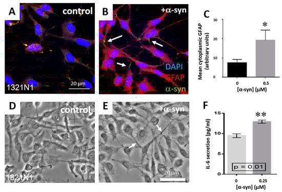 We hypothesized that α-syn treatments using the human protein may have reduced potency towards non-human cell types. Therefore, we conducted treatments of the human 1321N1 astrocytoma cell line as a model for human astrocytes. Treatment of 1321N1 astrocytoma cells with exogenous WT α-syn led to a statistically significant (p, 0.05) increase in GFAP immunofluorescence (Figure 2A–C) and α-syn aggregates were observed at the cell periphery (Figure 2B, arrows). α-Syn treated cells displayed extended and thicker processes by differential interference contrast microscopy (Figure 2D,E arrows), which was similar to the morphology of activated astrocytes observed in MSA tissue by GFAP immunofluorescence [].
