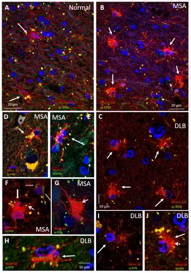 - Radford, R.; Rcom-H’Cheo-Gauthier, A.; Wong, M.; Eaton, E.D.; Quilty, M.; Blizzard, C.A.; Norazit, A.; Meedeniya, A.; Vickers, J.C.; Gai, W.P.; et al. The degree of astrocyte activation in multiple system atrophy is inversely proportional to the distance to α-synuclein inclusions. Mol. Cell. Neurosci. 2015, 65, 68–81. [Google Scholar] [CrossRef] [PubMed]