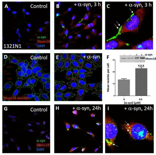 Munc18 is present in virtually all eukaryotic cells, including brain cells and the 1321N1 cell line, and is a generalized marker for endomembrane vesicles. In order to determine the effect of α-syn on Munc18-positive vesicles, 1321N1 cells were treated with exogenous human recombinant α-syn protein (0.5 µM) with granular α-syn accumulations at the cell periphery and increased cytoplasmic Munc18 puncta observed after 3 h incubation (Figure 4A–C) in treated compared to control vehicle-only cells. Munc18 was visualized via immunofluorescence, and the cells were imaged using compressed z-stacks by confocal microscopy. Munc18-positive vesicles and cells were counted via software analysis according to the inclusion and exclusion criteria described in Methods (Figure 1D,E). Experiments were conducted in triplicate and compared with controls (vehicle only). The average number of cells per field of view in the dataset was 22. Controls and treated groups were counted for the number of cells and the number of Munc18-positive vesicles based on DAPI and anti-Munc18 antibody immunostaining, respectively (Figure 4D,E). At the 3 h time point, the controls and α-syn treated groups were counted for the number of cells and number of Munc18-positive vesicles per cell based on DAPI and anti-Munc18 antibody immunostaining, respectively. Munc18-positive vesicles were significantly increased in mean number per cell after α-syn treatment (p, 0.001) and showed a 1.7-fold increase over controls (Figure 4F). Western blot analysis showed increased Munc18 expression in α-syn treated cells (Figure 4F, inset). As very little α-syn was observed within the cell body at 3 h incubation, being primarily at the cell periphery, we conducted an extended duration incubation with exogenous α-syn. At 24 h incubation, frequent cytoplasmic and perinuclear α-syn aggregates were observed (Figure 4G–I). The apparent slow uptake of exogenous α-syn is consistent with previous findings that uptake by primary rat astrocytes was slow in comparison with oligodendrocytes []. Occasional colocalization was observed between Munc18 puncta and α-syn (Figure 4C,I, arrows). Thus, exogenous WT α-syn treatment led to an activated phenotype as determined by extended morphology and increased GFAP expression (Figure 2A–F), as well as increased IL–6 secretion (Figure 4F) and increased Munc18-positive vesicles (Figure 4A–E) in 1321N1 cells, indicative of a secretory phenotype.