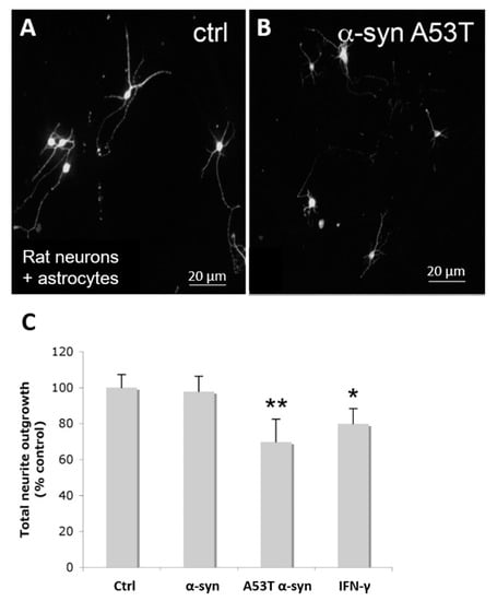 For primary astrocyte cultures, cerebral cortices dissected from postnatal days 1–3 hooded Wistar rats were placed in HBSS medium (Sigma, St. Louis, MO, USA), trypsinized and incubated at 37 °C for 25 min. The medium was replaced with DMEM + 10% fetal calf serum (Invitrogen, Boston, MA, USA) and tissue triturated, cell suspension filtered (0.6 mm gauze), diluted with DMEM-10S, centrifuged (10 min; 500× g; 4 °C), the supernatant removed and DMEM-10S added. The triturated cell suspension was cultivated in poly-L-lysine-coated flasks containing DMEM-10S and incubated for 24 h before the media was replaced. The media was then replaced every 48 h until the cells were confluent (8–10 days), then the flask was shaken (250 rpm; 37 °C; 24 h), medium replaced with fresh DMEM-10S supplemented with Ara-C (Sigma, Sydney, Australia) and repeated (48 h) before cells were split. Before experimentation, confluent cultures were maintained in serum-free medium for at least 3 days. Embryonic cortical neurons were dissected from embryonic day 17 hooded Wistar rat embryos, trypsinized and, following three washes with 10 mM HEPES to remove the trypsin, cells were plated directly onto confluent astrocyte cultures pretreated for 24 h with either 0.07 µM A53T α-syn, α-syn wild-type (WT), interferon-γ (IFN-γ) positive control or vehicle at a density of 10,000 cells/well on poly-L-lysine-coated 25 mm glass coverslips []. Cells were cultured in neurobasal media, B27 supplement, 0.1 mM glutamine, 200 U/mL gentamycin (Invitrogen). Cells were fixed with 4% paraformaldehyde and immunolabeled for the neuron-specific cytoskeletal protein βIII-tubulin and detected using an AlexaFluor-488 secondary antibody. Images were acquired on an Olympus BL-50 upright microscope using a Magnafire CCD camera. The images were imported into HCA-Vision (CSIRO, Sydney, Australia), and the following parameters were used to identify and measure neurites: neuron body channel = 1, size of prefilter = 6, top hat width = 99, minimum area of neuron body = 225 and minimum radius of neuron body = 7.