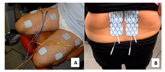 Combined neuromuscular electrical stimulation (NMES) set-up. The positioning of electrodes on the quadriceps muscles (A) and of the lumbar paraspinal muscles (B).