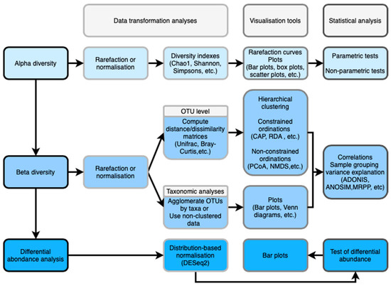 Quick overview of the microbial ecology analyses using bioinformatics tools. The figure shows the succession of analyses from alpha diversity to differential abundance and the three stages of analysis: data transformation, visualization tools, statistical analysis, of each step.