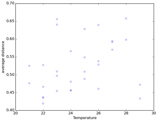 Creating a scatterplot representing average distances between samples (distance matrices), broken down by specified parameters (categories) is an alternative way to compare the microbial compositions of samples. The inputs are a distance matrix and a mapping file. The x-axis represents a category and must be numerical. In the primary state, each sample within the category will be compared to the other samples (or the one representing the secondary state) and an average of their distances will be calculated. The average distances will be plotted against a numerical category and are represented in the y-axis. The numerical category in the x-axis should preferably be linear and correlated somehow to the primary state. The points on the plot can then be colored according to another defined category. Thus, we have average distances between the groups we are comparing according to a linear parameter (e.g., variation of the microbial composition of bioaerosols according to days, temperature, etc.). An example of a scatterplot representing average distances between samples is presented in Figure 2. The distances were calculated between air samples collected in different wastewater treatment plants during summer and winter. The temperature did not affect the distance between air samples.