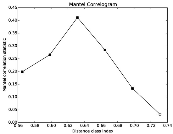 A Mantel correlogram produces a plot of distance classes versus Mantel statistics. Briefly, an ecological distance matrix and a second distance matrix (e.g., spatial distances, pH distances, etc.) are provided. In the second distance matrix distances are split into a number of distance classes (this number is determined by Sturge’s rule). A Mantel test is applied to these distance classes versus the ecological distance matrix. The Mantel statistics obtained from each of these tests can then be plotted in a correlogram. A filled symbol on the plot indicates that the Mantel statistic was statistically significant [101]. An example of a mantel correlogram plot is presented in Figure 3, using air samples from wastewater treatment plants compared with weighted and unweighted distance matrices.