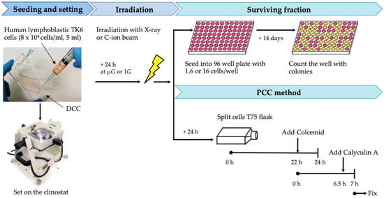 Figure 1 shows the details of experimental flow. Frozen TK6 cells were revived and cultured for 4 days prior to seeding into DCCs at the concentration of 8 × 104 cells/mL. The chamber was set on the 3D clinostat. Cells were on the clinostat (or the stationary clinostat) for 24 h prior to irradiation. The cells were then irradiated with X-ray or C-ion under μG condition without stopping clinostat rotation. For survival fraction analysis, cells were harvested immediately after irradiation, in order to observe the effect of radiation in the cells’ exposure under μG or 1G conditions. Regarding CA, cells were kept under μG or 1G conditions for 24 h after irradiation, to observe the unrepaired DNA damages.