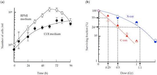Cells were obtained from ATCC (Manassas, VA, USA). Since the experiment was performed outside the CO2 incubator, cells were cultured in CO2-independent medium (COI) (Thermo Fischer Scientific, Waltham, MA, USA) containing 10% (ν/ν) fetal bovine serum (MP Biomedicals, Santa Ana, CA, USA), 200 mM L-glutamine (Thermo Fischer Scientific) and 1% (ν/ν) penicillin–streptomycin mixed solution (Nacalai Tesque, Kyoto, Japan), and kept at 37 °C. We also used RPMI medium (Thermo Fischer Scientific) containing 10% (ν/ν) fetal bovine serum (MP Biomedicals), 1% (ν/ν) penicillin–streptomycin mixed solution (Nacalai Tesque) and 10 mM-HEPES (Dojindo Molecular Technologies, Inc., Kumamoto, Japan) at 37 °C in a CO2 incubator for checking cellar growth. We used disposable, sealed irradiation cell culture chambers (DCC) (Chiyoda Co., Kanagawa, Japan) [,]. Exponentially growing cells were seeded into DCC.