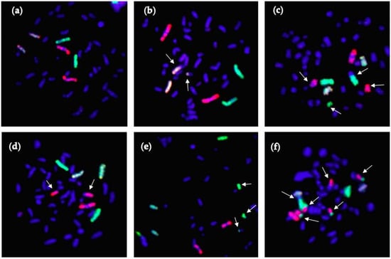 Examples of 3-color whole-chromosome FISH staining images of TK6 cells: chromosome 1 (red), chromosome 2 (green) and chromosome 4 (yellow). CA are identified by arrows as simple (reciprocal exchanges between two chromosomes) or complex-type exchanges (three or more breaks in two or more chromosomes). (a): normal chromosome spread; (b): simple type of exchange between chromosome 4 and another chromosome (dicentrics); (c): simple type of exchange between chromosome 1 and another chromosome (incomplete exchanges) and chromosome 2 and another chromosome; (d): fragmentation of chromosome 1; (e): complex type of exchange between chromosome 2 and other chromosomes; (f): complex type of exchange involving chromosomes 1, 2 and another chromosome.