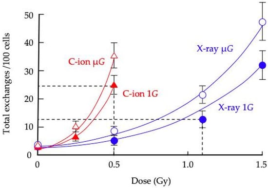 Figure 4 shows the relationship between irradiation doses and total exchanges. For each source of radiation, the frequency of CA increased with dose. The frequency of CA increased in cells exposed under the μG condition compared to those exposed under the static condition. At the same irradiation dose, CA was more frequently observed in C-ion irradiated cells than in X-ray irradiated counter parts. Furthermore, at the iso-survival fraction dose, C-ion irradiation produced more CA than X-ray irradiation.