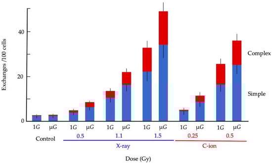 Based on the cell survival analysis, we irradiated cells with the doses that induce the same survival fraction. Compared to the cell irradiated with X-ray, higher frequencies of CA were observed with C-ion irradiation. It is well known that CA induction by heavy ions indicates a higher frequency of complex exchanged compare to low-LET radiation, and the observed rearrangements are of greater complexity []. The complex type of CA observed in cells irradiated with C-ion are higher compare to irradiated to X-ray both under μG and 1G in this study. Monte Carlo simulations as well as various other experiments indicate that complex DNA lesions with multiple damage sites, including double strand breaks, single strand breaks, and other damages within one or two helical turns referred to as clustered DNA damage are caused by heavy ion irradiation [,]. DNA breaks by X-ray irradiation are much less clustered, and it is likely to be repaired properly. Since clustered DNA breaks are difficult to correctly repair, breaks made by heavy ion irradiation are more likely to cause CAs.