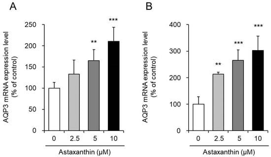 Effect of astaxanthin on the mRNA expression level of aquaporin-3 (AQP3) in PHK16-0b (A) and HaCaT (B) cells. Astaxanthin was added to PHK16-0b or HaCaT cells, and the cells were incubated for 6 h. The AQP3 mRNA expression level was measured by real-time RT-PCR. Expression levels were normalized to those of glyceraldehyde-3-phosphate dehydrogenase (GAPDH), and the data are presented as the mean values as a percentage of the control values, which were set to 100% (mean ± SD, n = 4; ** p < 0.01 and *** p < 0.001).