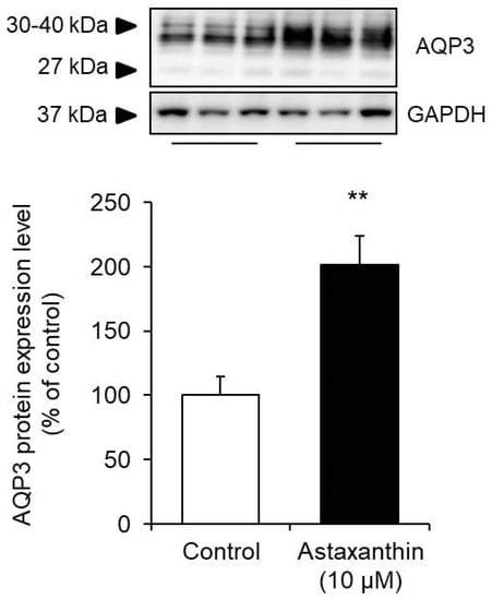 The protein expression level was measured by Western blotting, and the signal bands of AQP3 were detected at approximately 27 kDa and 30 to 40 kDa, which have been reported to correspond to nonglycosylated (27 kDa) and glycosylated (30 to 40 kDa) AQP3 [,]. The presence or absence of glycosylation results in differences in AQP stability and migration to the cell membrane but does not affect their water permeability functions [,,]. Therefore, in this study, the sum of these bands was analyzed as the expression level of AQP3. When astaxanthin was added to HaCaT cells, the protein expression of AQP3 increased significantly to a level nearly twofold higher than that in the corresponding control cells (Figure 2).