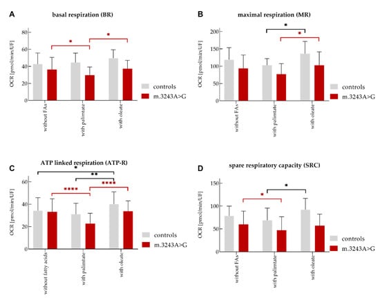 The treatment of cells with oleate only led to a significant increase of ATP-R in controls compared to the values without FAs. However, BR, MR, and SRC remained unchanged (Figure 1, Table 3).