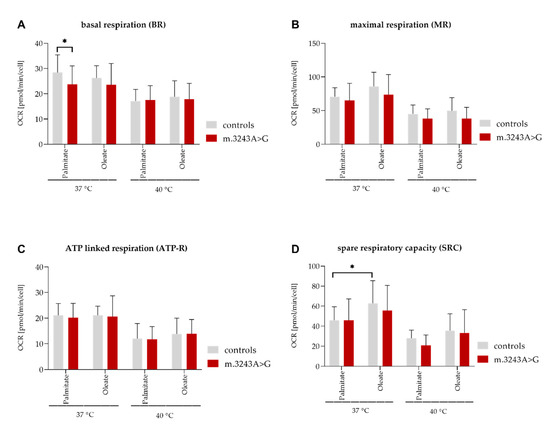 Independent of the applied substrate (oleate or palmitate), MR, ATP-R, and SRC were similar in patients and controls at 37 °C and 40 °C. BR was higher in controls than in patients, however, only at 37 °C and in presence of palmitate (Figure 2, Table 4). The increase of temperature from 37 °C to 40 °C led to a significant decrease in all key parameters (BR, MR, ATP-R, and SRC) in both, patients and controls (Table 5).