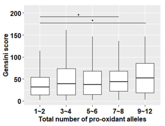Values of Gensini score (Q1–Q3) for subjects with 1–12 pro-oxidant alleles. Significant differences in Gensini scores between subjects with 1~2 risk alleles and those with 7~8 and 9~12 risk alleles were observed (p < 0.05, Kruskal–Wallis test, followed by Dunn’s Multiple Comparison Test).