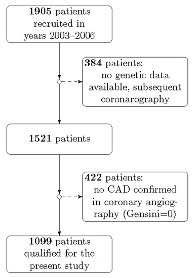 The study population was constructed in the framework of the project conducted in the First Department of Cardiology, Medical University of Gdansk between 2003 and 2006. Patients enrolled in this project had clinical symptoms of coronary artery disease (CAD) or positive non-invasive tests (exercise stress test, computed tomography angiogram, or scintigraphy of the heart), which qualified them for planned coronary angiography. The database was previously used in other genetic and non-genetic studies [42,65,66,67]. After considering the inclusion and exclusion criteria, 1099 individuals out of 1905 were recruited for the present study (Figure 2).