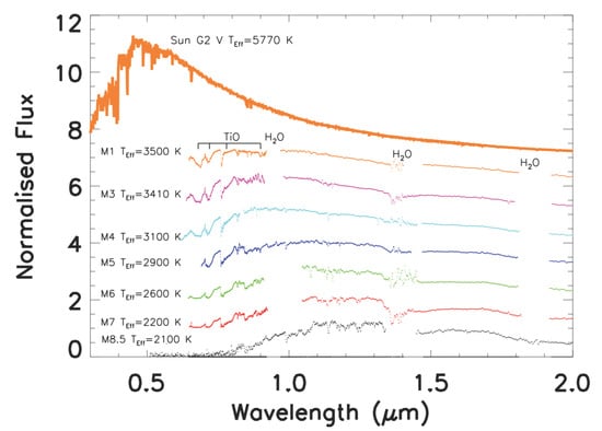 Examples of various M-stars spectra [26], from higher to lower photospheric tempretures. The main molecular bands depleting the visible and near infra-red (NIR) flux are also indicated. The spectral features of M-stars are indicated in Reference [27]. The upper part of the figure shows the spectrum of the Sun for comparison. The Sun and M star spectra have been normalized to the flux they emit at m and offset.