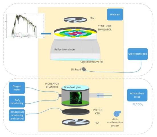 The experimental set up is sketched in Figure 2. It can be conceptually split into two parts: the stellar simulator on top, composed of the illuminator and a spectrometer, with the reaction cell on the bottom, where the microorganisms used for the experiments are hosted. The entire system is isolated in a dark container and is cooled by two fans, it is equipped with an anti-condensation system, and it is monitored through a webcam. A control PC allows to operate remotely the system without interfering with the experiment.