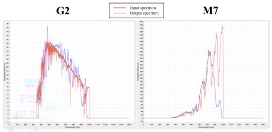 The illuminator is controlled by a custom control software [57] that, by means of a graphical user interface (GUI), allows the user to select an appropriate spectrum chosen from a spectral library. For the input spectrum, the control software calculates the intensities of the 25 channels to best fit the spectrum. In any case, through the GUI, the user has access to each channel of the illuminator setting the output flux of the channel. The set spectrum is shown in a window of the GUI. The emitted spectrum is registered by the spectrograph and is superimposed on the input spectrum. Slight differences between the two can be fixed by adjusting the luminosity of each channel. The left panel of Figure 3 shows the simulated spectrum of a solar star (light SOL; see Section 4.2), while the right panel of the same figure shows the simulated M star spectrum (light M7; see Section 4.2). In both panels the input spectrum is represented in red color, and the emitted spectrum in blue. The input spectra are smoothed (e.g., see Figure S1 in the Supplementary Materials for an M7 V star) due to the difficulties in reproducing the high resolution stellar spectra by the spectrum simulator.