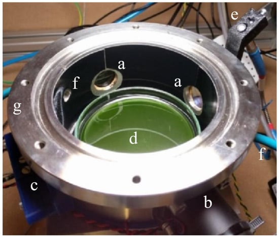 Reaction cell inside the Starlight simulator box. Side windows (a) provide access to the CO Tunable Diode Laser Absorption Spectroscopy (TDLAS) sensing channel (b) and to the fluorescence quenching O sensor (c). The reaction cell contains a Petri dish with target organisms inside (d). An optical fiber (e) provides feedback to the illuminator control spectrometer. The atmosphere inside the cell is flushed through input and output pipes (f). The flange (g) seals the cell with the top window (removed in this picture).
