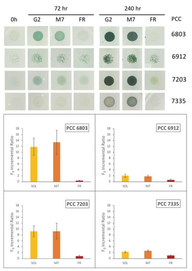 Top panel: Photos of the strains in individual plates show the phenotypes of the organisms. From left to right, at the beginning (0 h), after 72 h, and 240 h of exposure to sunlight (SOL), a star M7 (M7), and far-red (FR). The phenotype variation of the spotted strains is related to those with 0.7 initial optical density (OD). Bottom panel: Values of the F incremental ratio of the different organisms. The F incremental ratio is defined as follows: ()/, with F implying F value at 0 h and F corresponding to F value at 72 h. The F incremental ratio values are reported in Table S1 in the Supplementary Materials.