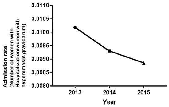 A total of 216,373 (13.6%) women were diagnosed with HG and had undergone the NHSE 1–2 years before their delivery between 1 January 2013 and 31 December 2015 in the Republic of Korea. In total, 2210 women were hospitalized due to HG (1.02%). Figure 1 demonstrates the annual trend of hospitalization due to HG from 2013 to 2015. The rate of hospitalization decreased significantly (p < 0.001).