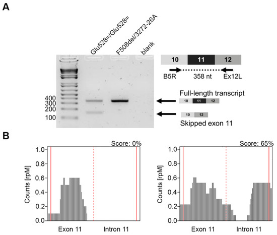 In addition, we employed RNA-Seq of the patient’s organoids. A close inspection of the coverage of the CFTR exon 11—intron 11 borders revealed sequencing reads mapping to the intronic region of the patients’ CFTR transcript (Figure 1B, right panel), suggesting intron retention. Notably, this effect is not detected in the healthy control (Figure 1B, left panel), suggesting the causality of the c.1584G>A sSNP for intron retention. It should be noted that RNA-Seq in this form of analysis cannot detect exon skipping. In sum, the CFTR transcript analyses with two independent methods provide evidence for aberrant splicing events leading to both exon 11 skipping and intron 11 retention.