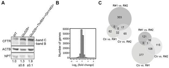 c.1584G>A sSNP augments CFTR protein expression and causes marginal alterations in the global gene expression. (A) Representative immunoblots of CFTR variants transiently expressed in CFBE41o- cells and probed with anti-CFTR NBD2 antibody (CFF#596). Band B and band C denote immature and mature CFTR glycoforms, respectively. Neomycin phosphotransferase (NPT), encoded on the same plasmid, served as an internal transfection control, whereas β-actin (ACTB) was utilized as loading control. WT, wild-type. The numbers under the blot represent a quantification C/(C + B) normalized to NPT and ACTB. Data are means ± SEM. (B) Fold-change of independent RNA-Seq replicate of the p.Glu528= patient-derived organoids (n = 2) compared to organoids from a non-CF individual. (C) Venn diagrams comparing the upregulated (right diagram) and downregulated genes (left diagram) between each independent replicate of the p.Glu528= organoids (R#1, R#2) and non-CF organoids (Ctr). The variability between the replicates (R#1 vs. R#2) is also included; Pearson’s coefficient, R2 = 0.92, indicating high reproducibility between the two replicates.