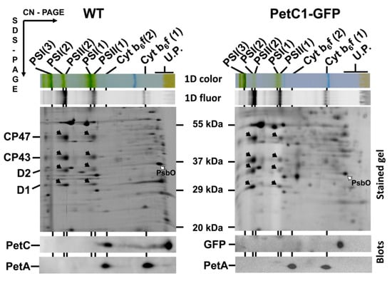 2D analysis of membrane proteins of WT and GFP-PetC1 expressing strains. Membranes isolated from cells were analyzed by 2D CN/SDS-PAGE in combination with immunoblotting. Dimeric and monomeric Cyt b6-f complexes were identified using anti PetA antibody, PetC in WT was identified using general anti PetC antibody. Designation of complexes: PSI(3), PSI(2), PSI(1), trimeric, dimeric and monomeric PSI complexes, resp.; PSII(2) and PSII(1), dimeric and monomeric PSII core complexes, resp.; Cyt b6-f(2) and Cyt b6-f(1), dimeric and monomeric cytochrome b6-f complexes, resp.; U.P. unassembled proteins. The large PSII proteins CP47, CP43, D2 and D1 within PSII monomers and dimers (black arrows) and the unassembled PsbO (empty arrow) were identified previously by mass spectrometry [,] and by immunoblotting []. Each loaded sample contained 5 µg of CHL.