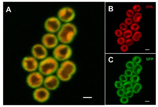 The cellular localization of the PetC1-GFP protein in Synechocystis was estimated by confocal microscopy (Figure 2A). TMs were imaged based on chlorophyll a (CHL) autofluorescence (Figure 2B) and their signal was then compared with the GFP signal of the PetC1-GFP (Figure 2C) that was acquired simultaneously. CHL fluorescence is emitted mostly from PSII, Figure 2B thus shows heterogeneous MD organization of PSII in thylakoids (i.e., less/more intense spots of CHL fluorescence) in line with the recently described TM heterogeneity [,,,]. The GFP signal of free PetC1-GFP protein generally overlapped with the CHL emission of PSII (Figure 2A) showing a rather uniform localization of the free PetC1-GFP protein mostly in TM even though PetC1-GFP was not localized in the cyt b6f complex (Figure 1). Only a small portion of the PetA1-GFP signal was located more peripherally to CHL forming a narrow “green shell” of the cells, which could reflect the localization of the protein within the plasma membrane (Figure 2).