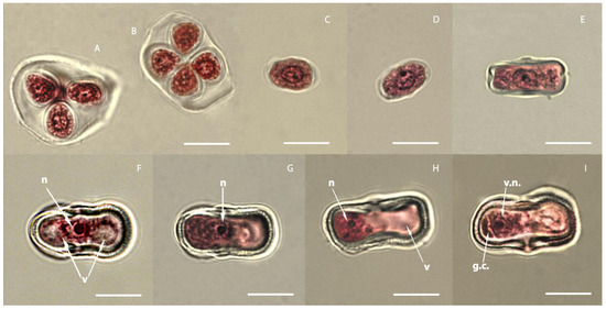 Developmental stages of carrot microspores and pollen. (A) Tetrahedral arrangement of microspores in a tetrad; (B) tetragonal location of microspores in the tetrad; (C) microspore of a round shape with a thin shell, just released from the tetrad (stage microspore 1); (D) microspore of round-elliptical shape with a thin shell (stage microspore 1); (E) an elliptical microspore with a visible envelope, a centrally located nucleus, and small vacuoles on both sides of the nucleus (stage microspore 2); (F) an elliptical microspore with a centrally located nucleus and two large vacuoles on either side of the nucleus; transverse thickenings/ribs begin to appear in the thickening shell (stage microspore 3); (G) microspore with a centrally located nucleus and large forming vacuoles on one side of the nucleus (stage microspore 4: beginning); (H) microspore with a nucleus located at one of the poles and a large vacuole that occupies most of the microspore (stage microspore 4); (I) two-celled pollen grain. n—nucleus; v—vacuole; vn—vegetative nucleus; gc—generative cell. Bars = 10 μm.