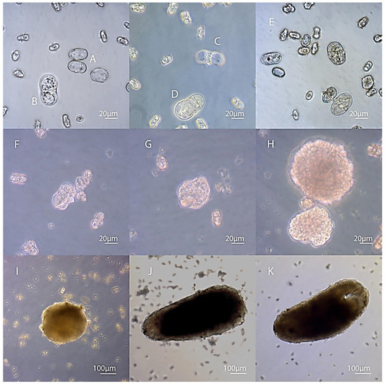 Microspore embryogenesis in Daucus carota L. (A) Microspores enlarged in size in three days of cultivation; (B) first microspore division (three days); (C) equal type of microspore division; (D) microspore divided into two cells unequal in volume; (E) in vitro culture at the proembryo formation stage (seven days); (F) proembryos formed by several cells and still surrounded by the exine (the microspore wall) on day 10 of cultivation; (G) release of the embryo-like structure from the original shell (14 days); (H) globular embryos (18 days); (I) globular embryos (24 days); (J) torpedo embryo (30 days); (K) cotyledonary embryos (35 days).