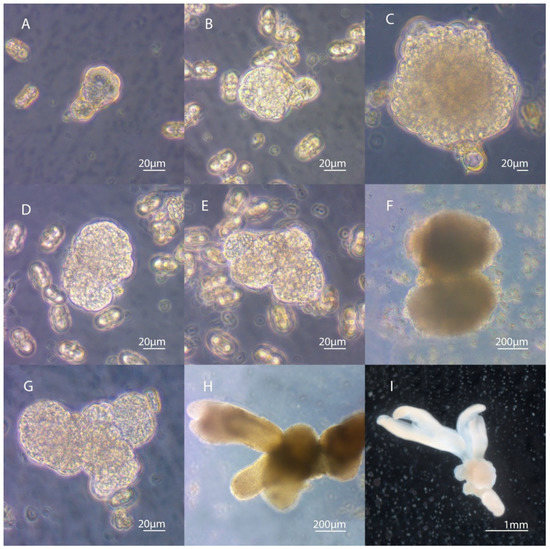Different types of embryoid formation in microspore culture. (A–C) The formation of an embryoid from only one cell after equal division of the microspore. The second cell does not develop and remains in the form of a suspensor-like structure. (D–F) The development of twin embryos connected to each other. Embryoids are formed by the simultaneous division in the two original cells. (G–I) Formation of interconnected polyembryoids. (I) The polyembryo observed under the stereomicroscope.