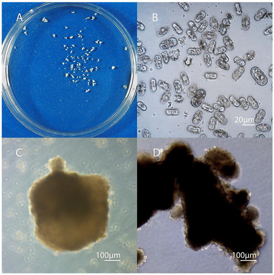 Morphological events in the culture of microspores on day 30–45 of cultivation. (A) Petri dish with the microspore-derived embryos produced in the culture of Daucus carota L. after 35 days of cultivation; (B) the death of proembryos/multicellular structures in weakly responsive genotypes after 30 days; (C) the formation of secondary embryoids on the surface of the globular embryo; (D) a large number of secondary embryoids on the surface of the cotyledon embryo (45 days).