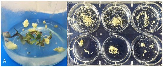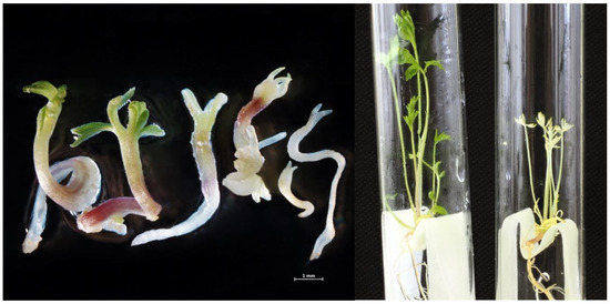 The embryos in the globular stage were transferred to an MSm [20] solid medium with 2% sucrose, 0.1 mg/L kinetin, and 0.7% agar, and were cultured at 22 °C during a 16 h photoperiod at an illuminance of 3000 Lx for 6–7 weeks. Developed embryos and/or embryogenic calli were transferred to filter paper bridges in glass tubes (20 mm × 200 mm) with a liquid MSm medium of the same content and cultured at the same conditions for 7–8 weeks.