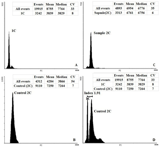 Flow cytometry histograms of carrot regenerants obtained from isolated microspore culture in vitro. External control samples were analyzed separately, without changing the cytometer settings. (A) Haploid; (B) the diploid (2n = 2x = 18) plants of carrots as a control; (C) diploid regenerated plant; (D) histogram of both the diploid control and haploid sample. Index: the difference between mean values of the peaks (mean).