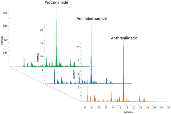 Glycans lack fluorescent moieties; therefore, several fluorophore tags have been used for glycan analysis in recent years, such as 2-aminobenzamide (2-AB), 2-anthranilic acid (2-AA), and 1-aminopyrene-3,6,8-trisulfonic acid (APTS) [20]. Latest advances in glycoanalytics have revealed significantly different fluorescence signal intensities and MS ionization efficiencies between the different labels [21]. To measure these disparities, equal amounts (10 μg) of dextran ladders were reductively aminated by 2-AB, 2-AA, and procainamide followed by HILIC-UPLC analysis with fluorescence and MS detection. As visualized in Figure S1, procainamide labeling provides more than 12 times higher fluorescence signal intensities and 2 magnitudes higher MS ionization efficiency in positive mode (Figure S2). Mass spectrometric measurements were also performed in negative mode, where the procainamide-labeled sample also provided the highest intensity (data not shown). These results are in agreement with Keser et al., suggesting higher detection sensitivity by procainamide labeling compared to 2-AB [21]. To further develop this improvement, we examined the compatibility of our recently developed magnetic nanoparticle-based sample clean-up with procainamide-labeled glycans. Firstly, glycans were released from 5 µL of human serum and reductively aminated by 2-AB, 2-AA, and procainamide, followed by a magnetic-nanoparticle-based sample purification. All of the nanoparticle synthesis and glycan purification steps were identical to the protocol published recently [17]. As visualized in Figure 1, the inhouse-synthetized magnetic nanoparticles could be used for the purification of glycans labeled with negatively charged (anthranilic acid), neutral (aminobenzamide), and positively charged (procainamide) fluorescent tags as well. Based on this result, procainamide labeling, with increased detection sensitivity and inhouse-synthetized magnetic nanoparticle-based sample clean-up, was used to analyze patient samples by quantitative HILIC-UPLC/FLR.