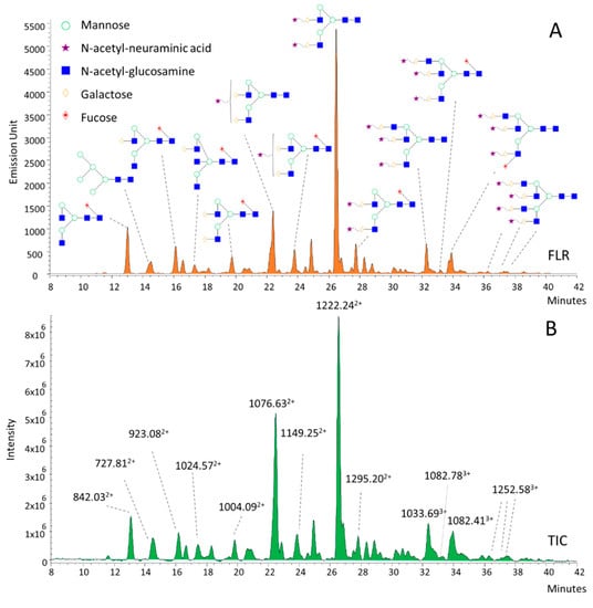 HILIC-UPLC profile of procainamide-labeled serum N-glycans by fluorescence (A) and mass spectrometric detection (B).