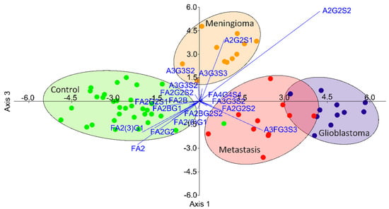 During the data analysis, 46 glycan structures were quantified from 66 participants (33 patients, 33 healthy controls); 30 showed significantly altered relative areas, as listed in Table S1. One of the main trends comparing the controls to all brain cancer patients was the lower level of neutral and biantennary structures and the subsequently higher ratio of tri- and tetra-antennary structures with terminal sialic acids in cancer patients (Figure S5). To determine the order of importance is challenging when the number of significant alterations is high; thus, a linear discriminant analysis was performed on the relative peak areas. As shown in Figure 3, the different disease groups can be well-separated based on their glycan distributions, with a slight overlap of the groups of glioblastoma and metastatic patients. The contribution of the individual structures is also visualized on this biplot, suggesting the main alterations by which the groups can be isolated. It can be seen that the separation of the control group is due to the altered ratio of biantennary neutral structures (as described above), while the patients with meningioma had altered sialylation and the glioblastoma-metastatic patients showed altered fucosylation.