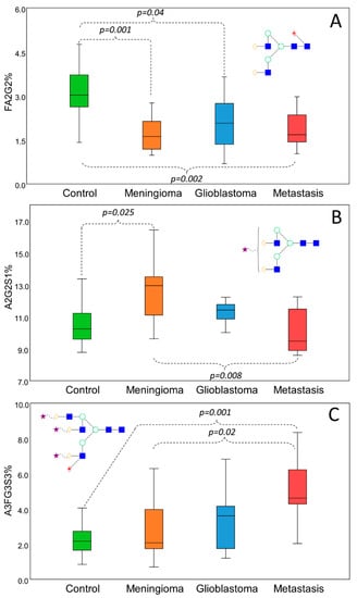 To verify the credibility of the biplot generated by linear discriminant analysis, pairwise comparisons were performed to identify some of the main significant alterations between the different groups (Figure 4). Representing the main alterations, FA2G2 (Figure 4A), A2G2S1 (Figure 4B), and A3FG3S3 (Figure 4C) were selected to show the typical distribution of biantennary neutral, sialylated but nonfucosylated, and sialylated–fucosylated structures. As shown in Figure 4A, FA2G2 was significantly higher in the control group compared to all the different groups of brain cancer patients. This distribution was typical for all biantennary neutral glycans, mainly contributing to the isolation of the control group. Increased sialylation was found to be responsible for the separation of the patients with meningioma, which was found to be significant compared to the controls and to the patients with metastasis as well in the case of A2G2S1 (Figure 4B); however, A2G2S2 and A3G3S3 also showed the very same deviation (data not shown). The patients with glioblastoma and metastasis have shown increased fucosylation on bi-, tri-, and tetra-antennary sialylated structures. As shown in Figure 4C, α1-3/4-linked A3FG3S3 was significantly increased in patients with metastasis compared to the controls and patients with meningioma.