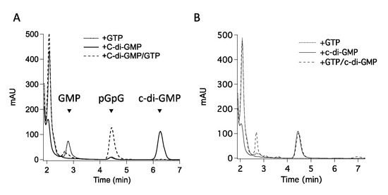 - Shanahan, C.A.; Gaffney, B.L.; Jones, R.A.; Strobel, S.A. Identification of c-di-GMP Derivatives Resistant to an EAL Domain Phosphodiesterase. Biochemistry 2013, 52, 365–377. [Google Scholar] [CrossRef][Green Version]