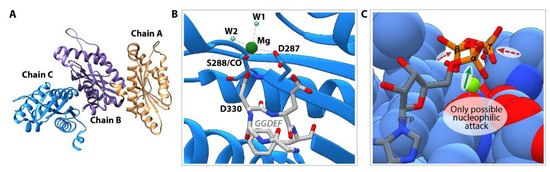 The versatile reactivity of the GGDEF domain seems to be related to a conformational issue rather than to an altered active site (as compared to the catalytically competent site required for DGC reaction): this may explain the alternative reactivity of the same protein towards GTP, depending on the allosteric status of the protein. This hypothesis has been confirmed by solving the 3D structure of the YfiNGGDEF protein in complex with Mg2+ by X-ray crystallography at 2.8 Å resolution. The crystal contained 3 monomers in the asymmetric unit (Figure 5A) and protein interface surface analysis performed using the PISA server (https://www.ebi.ac.uk/msd-srv/prot_int/cgi-bin/piserver) showed that all protein-protein interfaces of the crystal lattice would not be stable in solution, confirming that YfiNGGDEF is monomeric (as previously demonstrated in solution [18]). A magnesium ion is bound in the GTP binding site, coordinated by the oxygen atoms of D287, S288(CO), D330 (belonging to the GGDEF signature), and two water molecules (Figure 5B). Superposition with the recently solved structure of RmcA in complex with GTP and calcium [5], shows that the metal ions occupy the same position and that the two water molecules replace the oxygen provided by the β and γ phosphate groups of GTP (Figure 5C). The GTP substrate docks to the GGDEF domain in an extended conformation and a side reaction leading to the formation of c-GMP can be excluded given the position of the 3′-OH, which is too far from the α-phosphate to perform a nucleophilic attack. A closer look at the position of the phosphate groups with respect to the substrate-binding pocket indicates that the α-phosphate is particularly exposed to the solvent and, if the catalytically competent dimer does not form, may undergo a nucleophilic attack by a hydroxyl ion, thus producing GMP (Figure 5C).