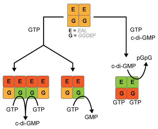 Scheme of the reactivity of DUAL RmcA with GTP, with or without c-di-GMP. E, EAL domain, G, GGDEF domain. In green the domains performing turnover, in red the domain in a resting state, in orange non-activated domain. It is not excluded that the red and the orange state of the EAL domain could show the same conformation.