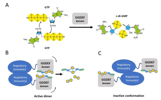 (A) In order to yield c-di-GMP, two GTP molecules must come in close proximity. Since each GGEDF domain binds only one GTP molecule, for the condensation reaction to occur two GGDEF domain must dimerize as shown in panel (B). The GGDEF containing enzymes respond to environmental stimuli by switching from an active conformation (B) to an inactive one in which the two GGDEF domain are not able to interact (panel (C)).
